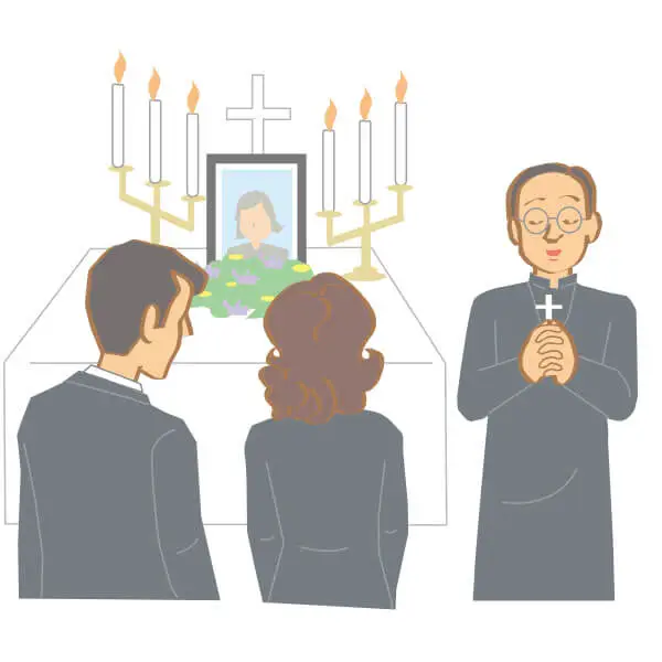 - 神父と遺族の手によって納棺が行われた後、ご遺体を安置した祭壇に遺影、十字架、ロウソク、聖水、生花などを飾ります。参列者一同が着席し、全員による聖歌斉唱、神父による聖書の朗読・説教が行われ、全員でお祈りをします。最後に参列者全員による献花が行われ終わります。